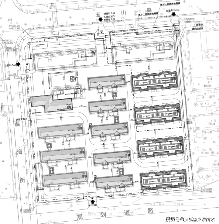 配建一个下沉式庭院会所,主出入口在玉山路,淮海街上设有一人行出入口,南侧规划道路还有一车行出口。