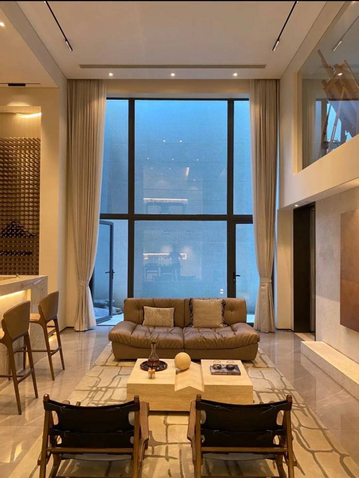 少数做精装的基本也不含地下室,有种“西装配短裤”的怪异感。去年一位朋友的精装叠墅交付后,毛坯地下室又装修了大半年,精装地下室挑高约5.6米,改造完后面积足有约130㎡。得益于台地地形,地下室十分干爽,样板房甚至不用开除湿机。部分还借高差做出了下沉庭院,拥有自然采光通风,待一天都不会憋闷。