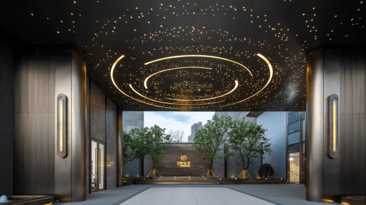 考究社区入口、舒适大堂入口、奢雅会所入口协同构建地上归家体系,艺术地下大堂营造简约轻奢的地下归家体系。