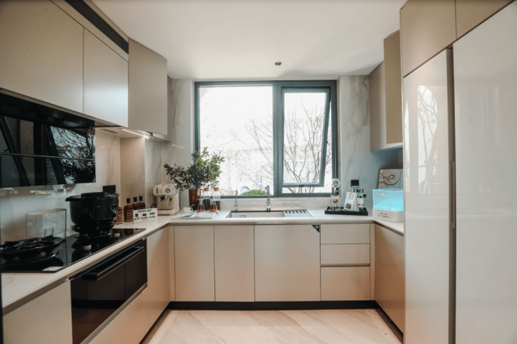关于厨房配置,普通人就关心两件事:省空间+不操心,中环铂樾这波操作也是很讨巧 。 U型厨房让拿菜、洗菜、切菜、炒菜一气呵成, 超长台面能塞下3个人 , 全家一起包饺子都能不打架。主妇炒菜时老公切菜、娃在旁边偷吃,还能边做饭边唠嗑,这哪是厨房?这是家庭社交现场。