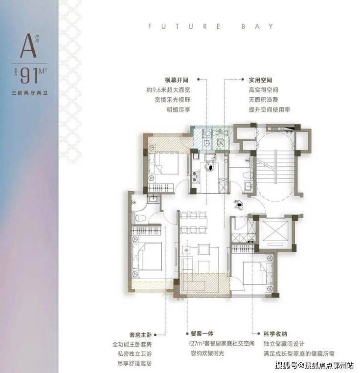 建面约91方真三房户型,真南北通透洋房产品北侧无消防连廊设计,小面积也是真南北通透,区别市面2+ 1户型,最小的卧室也有将近9个平方,每个卧室面宽均达到3米及以上