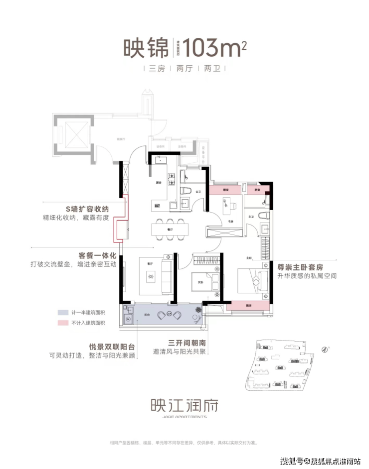 亮点五:双联阳台+多飘窗赠送、灵动空间。映江润府103户型,实现了100平级别难得的双联阳台,实现了室内空间的横向延伸,同时,搭配主卧、主卫、书房的“全飘窗”设计,赋予了空间更多灵动的使用场景。