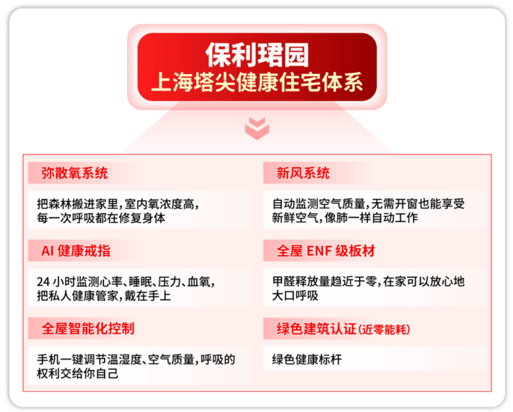 上海住宅首发的弥散氧系统,搭配AI戒指、全屋新风系统和全屋智能控制提醒,守护业主的每一次吐纳,ENF环保板材与近零能耗建筑奠定健康基底