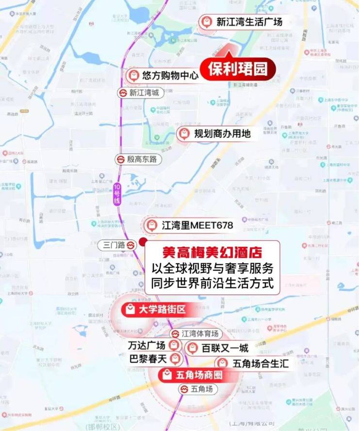 ①繁华商业:周边环绕江湾里MEET678、五角场商圈、大学路等五大商圈,已官宣入驻的美高梅美幻酒店将同步世界前沿生活