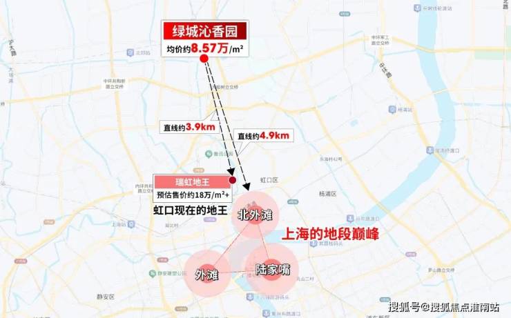 其次,项目距离预计约18万+的瑞虹地王直线约3.9km、距离北外滩直线约4.9km,几乎就是一脚油门就能抵达的存在。