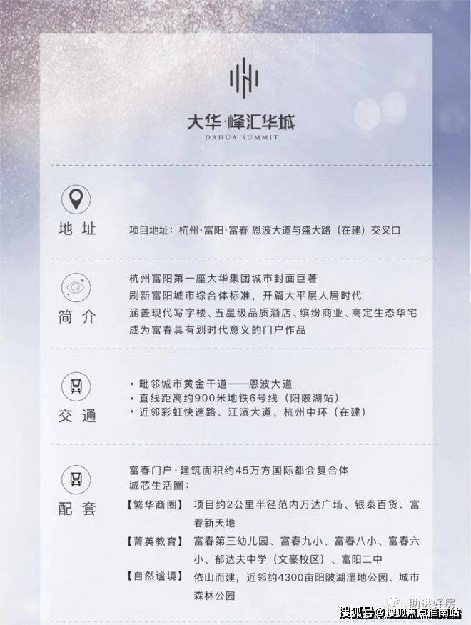 面积区间:建面85-125㎡,参考均价:住宅23992元/㎡,地铁6号线作为连接富阳与杭州的重要枢纽,沿线可换乘4号线、5号线、1号线,快速抵达杭州武林、钱江新城等商圈,直线距离仅约800米。