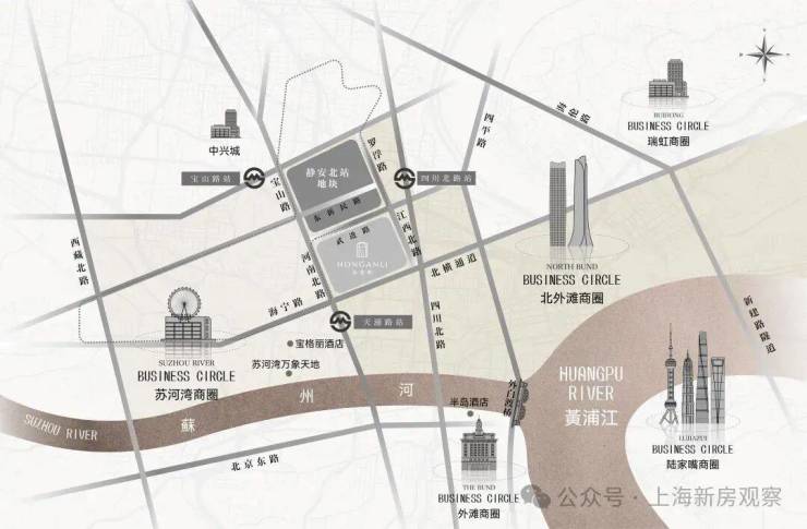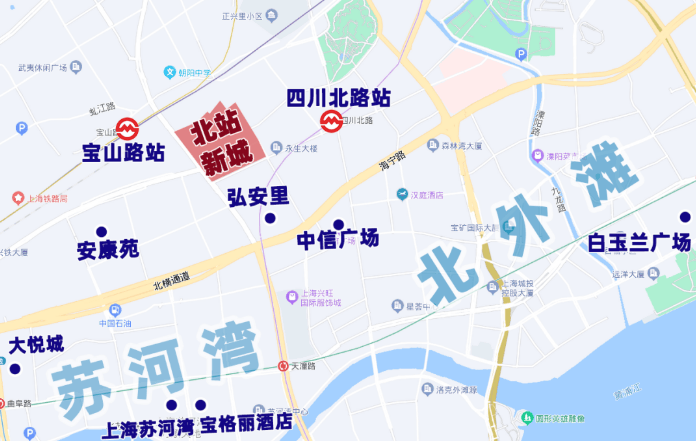 仅从图上看,该地块直线距苏州河约1公里,直线距外滩约1.4公里,直线距北外滩约1.7公里,直线距3/4号线宝山路站约300米,直线距10号线四川北路站约560米,区位优势明显。