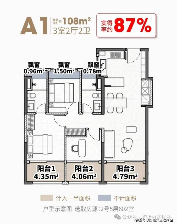 阳台+飘窗算下来,约108㎡户型的实得率达到了惊人的约87%,实得面积约94㎡!