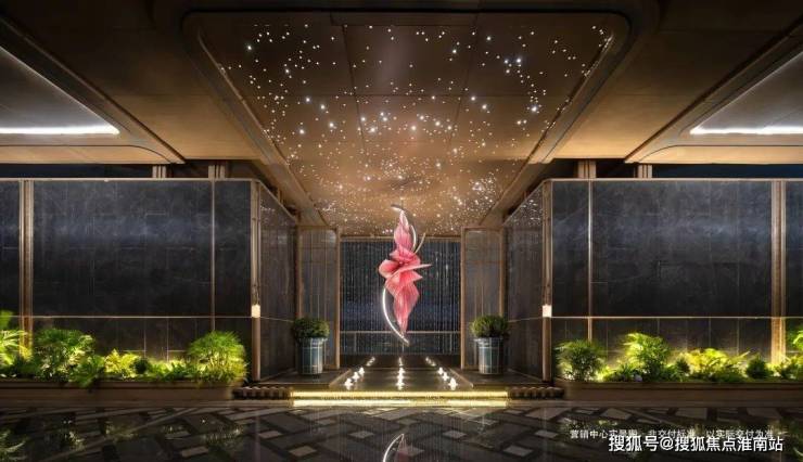 下沉式环幕庭院,跌水景观环绕,池底仿黑金砂与宝石晶片闪烁,点缀百余灯珠,师法“琉璃水光” 形意,糅合视听五感,打造全浸式立体园境,天工巧夺,嘉定未见。