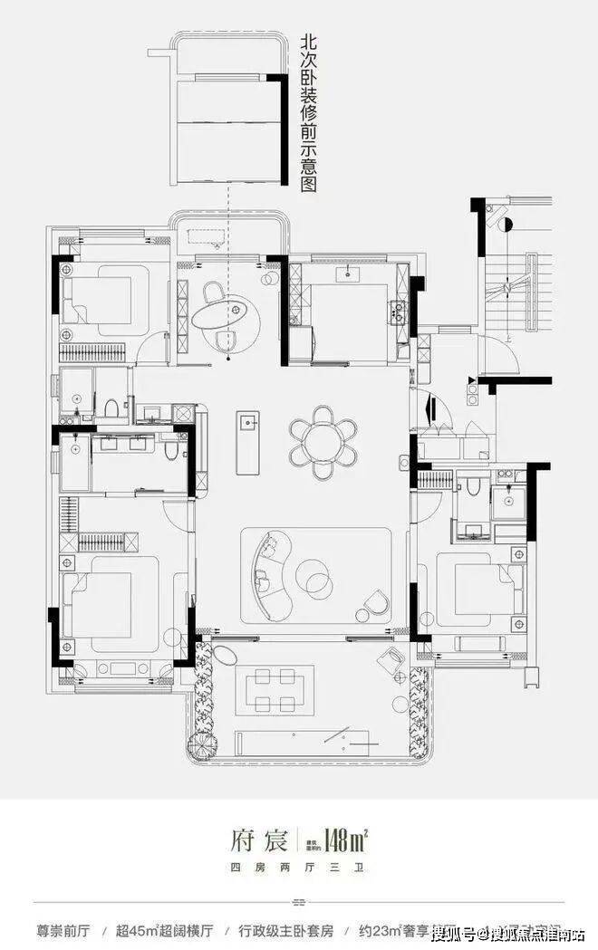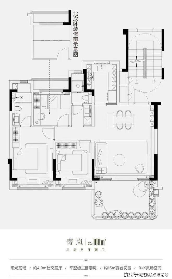主力户型包括100㎡(3室2厅2卫)和148㎡(4室2厅3卫),148㎡户型含双套房设计及约23㎡奢享花园