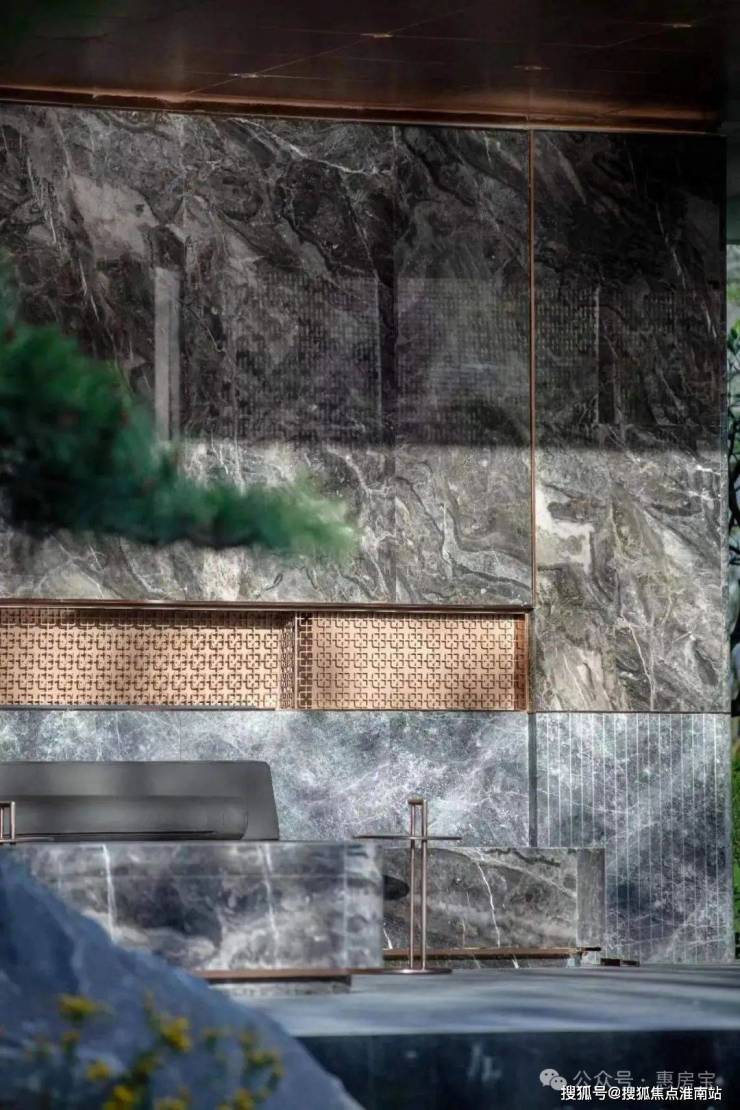 水景一侧是一段曲折幽静的星空连廊,能遮风挡雨的同时,也能提供游园般的归家体验。星空连廊的顶面采用香槟金铝板、墙面为爱马仕灰仿石砖,并镶嵌金属线条、就连地面都采用了夜里雪仿石砖第四,由石材&铝板构筑的第二景观会客厅!