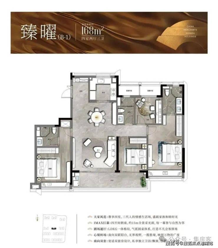 以中间套为例,建面约123㎡的户型做到了主次卧+客厅 四开间朝南,伸展开约13.3米的超大面宽,对应双开间阳台与飘窗的设计,进一步提升了全屋的采光。此外,一体化的餐客厅,“一镜到底”活动空间,在视觉上拉大了户型的朗阔尺度。
