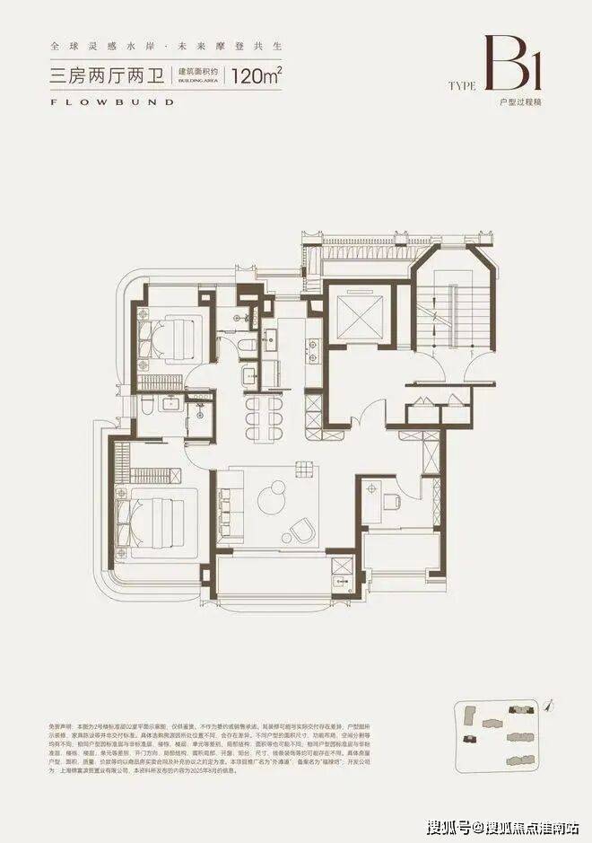 建面约120㎡三房,子母门入户,更显雍容。户型空间拥有阔绰尺度,南向双阳台的设计,让整体采光面更加宽阔,室内更加通透明亮。主卧弧形飘窗的设计,拥有环幕级视野。